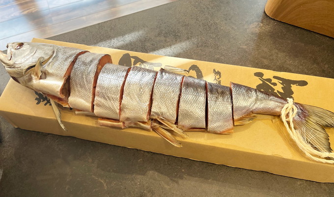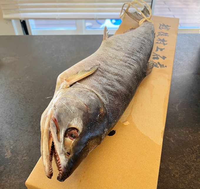 試食でも撮影でも美味しい!と評判だった村上の塩引き鮭(寒風干し)を買ってみました。正面から見たらこのまなざし。強そうです。