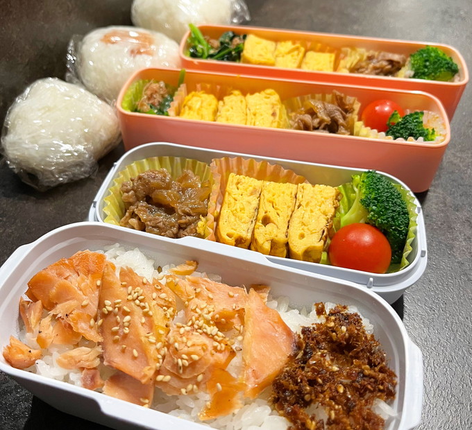 残った分は翌日の子供たちの弁当へ。11歳長女は鮭ごはん、6歳次女は小さいおにぎり2つ、6歳三女は大きいおにぎり1つをリクエスト。