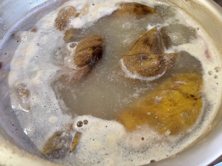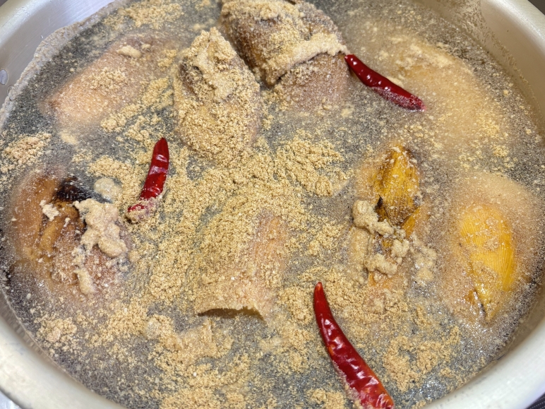 ・皮付きのまま、米ぬかと唐辛子で、冷めるまでじっくり茹で、えぐみを取るため、茹で汁に浸したまま完全に冷ます。