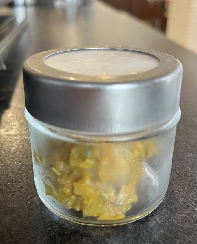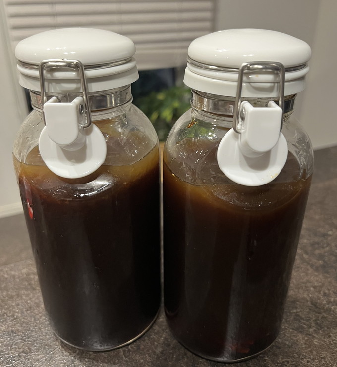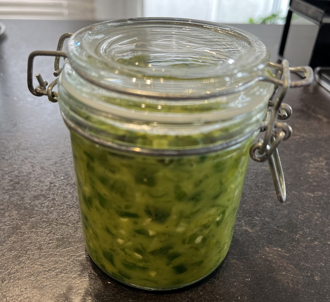 煮沸した瓶に詰めてできあがり。冷蔵庫で数週間寝かせておきます。おいしくなぁれ。