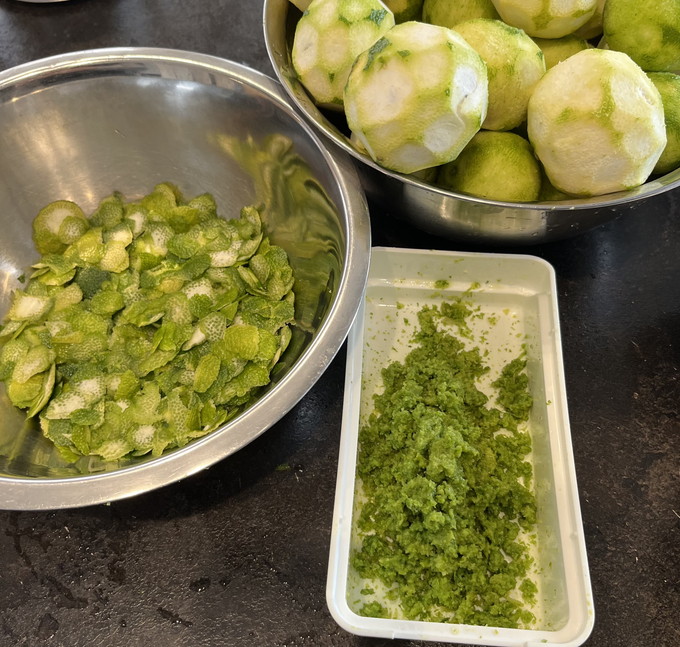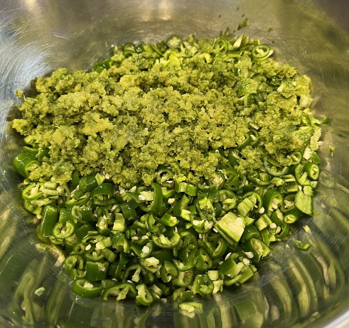 唐辛子は23本と柚子の皮をみじん切りにして、25%の塩を加えて柚子果汁を1個分絞り入れて混ぜます。